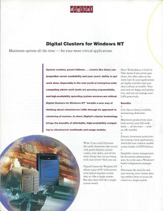 This document describes "Digital Clusters for Windows NT," a high-availability solution designed to ensure maximum uptime and continuous operation for critical client/server applications.