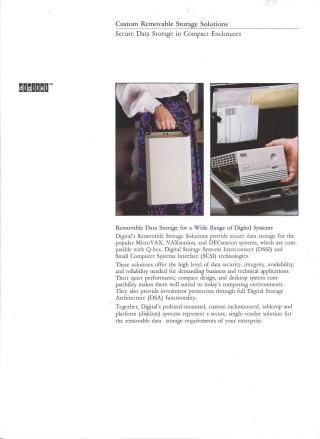 This document describes Digital's Custom Removable Storage Solutions, designed to provide secure, flexible, and reliable data storage in compact enclosures for a range of Digital systems, including MicroVAX, VAXstation, and DECstation, compatible with Q-bus, Digital Storage Systems Interconnect (DSSI), and Small Computer System Interface (SCSI) technologies.