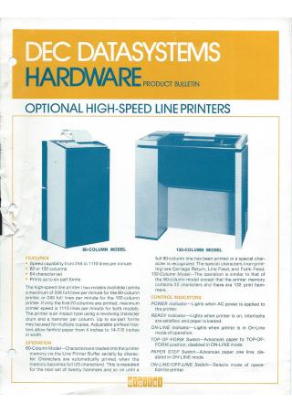 This DEC Datasysems Hardware Product Bulletin introduces optional high-speed line printers, available in two models: an 80-column version and a 132-column version.