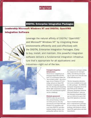 DIGITAL Enterprise Integration Server for OpenVMS: This server-side package enables OpenVMS systems to fully participate in a distributed Windows NT environment. It offers comprehensive features including: