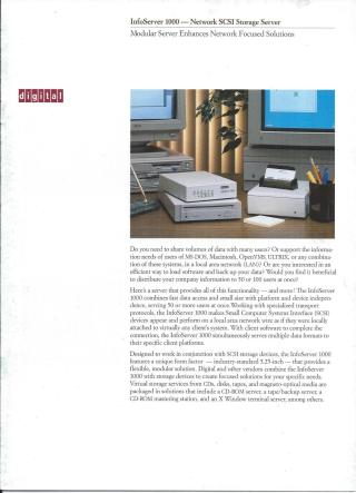 - Modularity and Scalability: Its compact 5.25-inch form factor allows it to be combined with up to seven SCSI devices (CD-ROM, tape, hard disk, magneto-optical drives) per unit. Multiple InfoServer 1000 units can be added to a network, offering high scalability, failover, and load balancing.