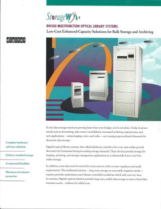 The Digital RW500 Multifunction Optical Library Systems are a family of low-cost, high-capacity solutions designed for bulk data storage and archiving, offering a "near online" alternative to traditional magnetic storage. Addressing growing data storage needs and budget constraints, these optical jukeboxes provide significantly lower cost per megabyte.