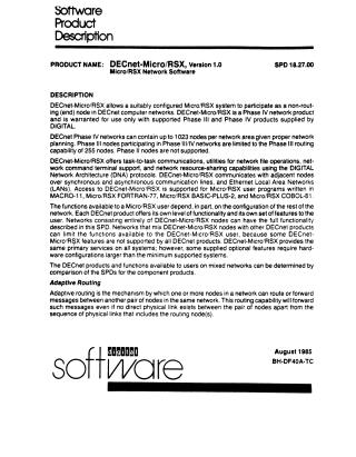 DECnet-Micro/RSX, Version 1.0 is network software designed to enable suitably configured Micro/RSX systems to function as non-routing (end) nodes within DIGITAL's DECnet computer networks, specifically Phase IV. It is also compatible with supported Phase III products.
