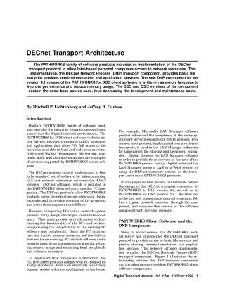 This document describes the redesign and implementation of the DECnet Network Process (DNP) transport component for Digital's PATHWORKS client software, specifically for versions 4.1 (DOS) and 2.0 (OS/2). PATHWORKS integrates Intel-based personal computers into Digital's network environment, providing services like file sharing, printing, terminal emulation, and application access using the DECnet protocol.