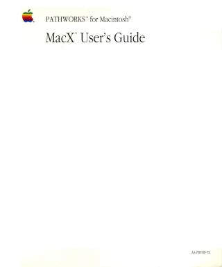 This document serves as a user guide for MacX, Apple Computer's X Window System server tailored for Macintosh computers, specifically within the PATHWORKS for Macintosh product environment. It details how MacX integrates X Window System functionality with the Macintosh user interface, enabling users to run remote X applications, particularly DECwindows applications.