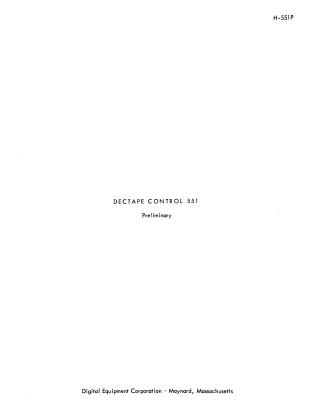This document is a preliminary technical manual (H-551P) for the Digital Equipment Corporation (DEC) DECtape Control Type 551, copyrighted 1965. It contains proprietary information intended for customers to use and maintain DEC equipment.