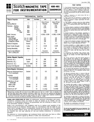 This document provides technical data for Scotch Magnetic Tapes models 480 and 481, designed for instrumentation, as of November 1966.