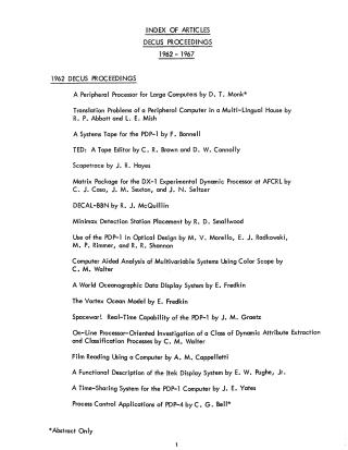 This document is an index of articles and papers presented at various Digital Equipment Computer Users Society (DECUS) proceedings and symposia held between 1962 and 1969.