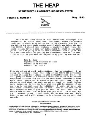 This document, Volume 6, Number 1 of "The Heap" (formerly the Structured Languages SIG Newsletter, May 1983), serves as an introductory issue under its new editor, John R. Barr, after a period of inactivity.