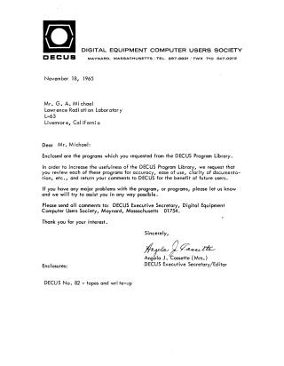 Accompanying the write-up is a letter from DECUS, indicating that the programs were distributed from their Program Library and requesting users to review them for accuracy, ease of use, and clarity of documentation, with an offer of support for major issues.