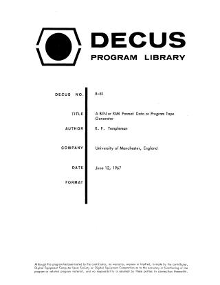 This document describes DECUS program 8-81, "A BIN or RIM Format Data or Program Tape Generator," developed by R.F. Templeman at the University of Manchester in 1967 for the PDP-8 computer.