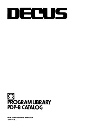 This document is the DECUS Program Library PDP-8 Catalog, published in August 1978 by the Digital Equipment Computer Users Society (DECUS).