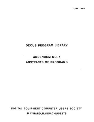 This document is "DECUS Program Library Addendum No. 1, Abstracts of Programs," published in June 1966 by the Digital Equipment Computer Users Society (DECUS).