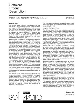 The DECnet Router Server, Version 1.2, is a software product designed to provide DECnet routing functions within a network. It runs on Digital's Ethernet Communications Server hardware, primarily connecting DECnet nodes on an Ethernet LAN to other nodes located off the Ethernet via synchronous and asynchronous communication lines.