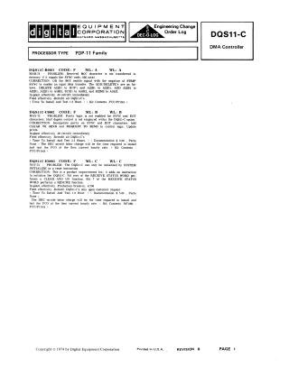 - DQS11C-B0001 (Mar-73): Corrected a problem where the BCC (Block Check Character) was not transferred to memory if it matched the SYNC code. The fix involved modifying logic and replacing specific components to enable proper input data transfer. This was an immediate retrofit for all DQS11-C units.