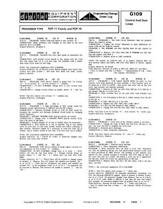 This document is an Engineering Change Order (ECO) Log for the G109 Control And Data Loops module, used in PDP-11 and PDP-15 processor systems. It details various problems identified and their corresponding corrections from August 1972 to March 1973.