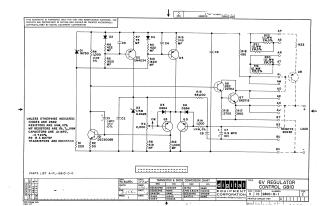 The schematic details an electronic circuit featuring multiple transistors (e.g., Q1-Q7), diodes (e.g., D1-D6), resistors, and capacitors arranged to perform voltage regulation. It includes an adjustable potentiometer (R9 labeled 'CW'), and an output section labeled 'LOAD' with various connection points (AP to BV) and a 'REMOTE SENSE' capability.