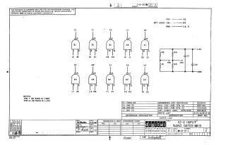 The schematic details a circuit primarily composed of ten two-input NAND gates, utilizing DEC7400N integrated circuits (labeled E1 through E3). It includes a power supply section deriving +3V from a +5V source, with a -15V line noted as unused. Key notes specify standard IC pin assignments: Pin 7 for Ground (GND) and Pin 14 for +5V.