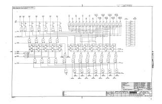 The schematic details a digital logic circuit primarily constructed using various 74-series Integrated Circuits (including gates, flip-flops, and other logic elements), along with resistors and capacitors. The circuit features numerous input/output signals, indicating its role in managing a line register with associated control logic, potentially involving memory addressing (e.g., HO(0-63), G ranges), timing/incrementing (e.g., TTINCR, TTSLI, TTLL), and memory/bus arbitration (e.g., MEM, BAC signals). A parts list is included, detailing the specific components by DEC part number and type.