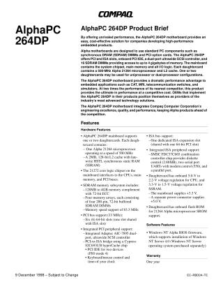 This document describes the Compaq AlphaPC 264DP motherboard, a high-performance, cost-effective solution designed for companies developing embedded products.