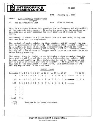 This document describes the "Complementing Checkerboard Program," a utility designed to thoroughly test the performance and reliability of magnetic core memory.