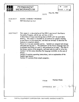 This document is an outline of the PDP-1 Macro Assembly Program, developed at MIT in 1962, intended as an interim guide for users. It describes Macro as a two-pass assembly system: Pass 1 assigns symbols and allocates storage, and Pass 2 translates the Macro language into a binary program tape for execution.