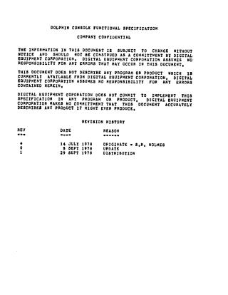 This document is a Functional Specification for the Dolphin Console, marked "COMPANY CONFIDENTIAL" and dated September 1978. It outlines the design and operational requirements for a critical system component, explicitly stating that the information is subject to change and not a binding commitment.