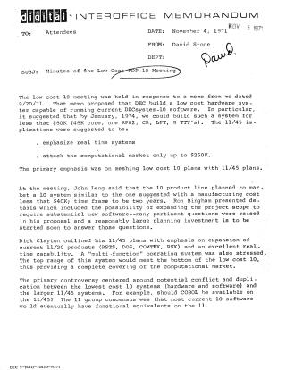 The meeting was initiated by a proposal from David Stone for DEC to build a low-cost DECsystem-10 hardware system (under $80K by January 1974) capable of running existing DECsystem-10 software. This was intended to emphasize real-time systems and target the computational market up to $250K, with a primary goal of meshing these plans with the PDP-11/45's development.