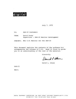 This document is an introductory guide to the Digital Equipment Corporation's 5.01 Monitor software kit for PDP-10 customers, released on July 7, 1970. Its primary purpose is to explain the contents of the software kit and help users understand the accompanying material.