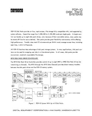 This document describes the PDP-10 Disk Pack Systems, which provide on-line, rapid-access, and software-compatible file storage for PDP-10 computers. These systems are designed for flexibility, economy, and high performance, supporting various PDP-10 Monitor applications and time-shared systems for swapping user jobs and expandable file storage.