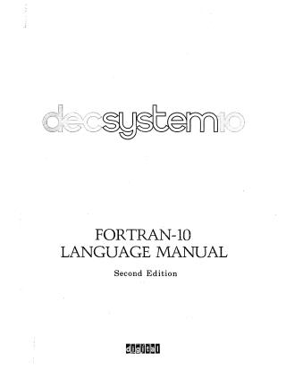 - The FORTRAN-10 language fundamentals, including its character set, statement structure, various data types (integer, real, double precision, complex, octal, logical, literal, statement labels), symbolic names, variables, and arrays (with specifics on subscripts, dimensioning, and storage order).
