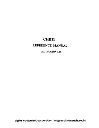 This reference manual, published by Digital Equipment Corporation in April 1976, details the CHK11 hardware test software. It is designed for individuals responsible for loading PDP-11 communications systems (such as DAS44, DAS78, DN80, DN81, DN82, DN85, and DN87) and provides the necessary information to interpret the output displayed by CHK11.