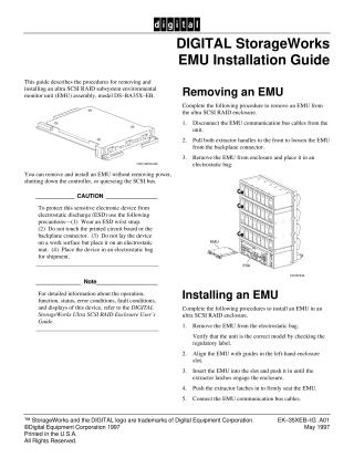 This document, the "DIGITAL StorageWorks EMU Installation Guide," provides instructions for removing and installing an ultra SCSI RAID subsystem environmental monitor unit (EMU) assembly, model DS-BA35X-EB.