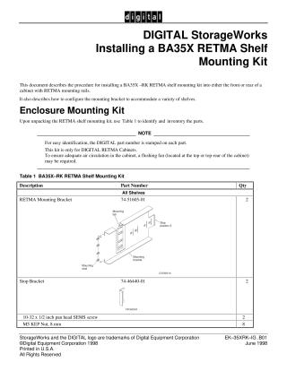 This document provides instructions for installing the DIGITAL StorageWorks BA35X-RK RETMA shelf mounting kit into the front or rear of a cabinet equipped with RETMA mounting rails. It also details how to configure the mounting brackets to accommodate shelves of varying depths.