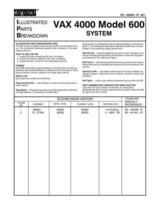 This document, titled "ILLUSTRATED VAX 4000 Model 600 PARTS BREAKDOWN SYSTEM (EK-456AA-IP.A01)", is a technical manual designed to help users identify and locate specific hardware components within the VAX 4000 Model 600 system.