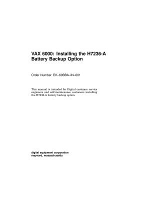 This document, titled "VAX 6000: Installing the H7236-A Battery Backup Option" (Order Number EK-60BBA-IN-001), is a technical manual from Digital Equipment Corporation. It is intended for Digital customer service engineers and self-maintenance customers who need to install the H7236-A battery backup option in a VAX 6000 series system.