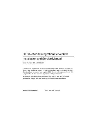 This "DEC Network Integration Server 600 Installation and Service Manual" provides comprehensive instructions for installing, testing, upgrading, and servicing the DECNIS 600 hardware system. It is specifically designed for service personnel who are experienced in network hardware installation and servicing, and are familiar with concepts such as LANs, WANs, IP, X.25, DECnet/OSI, and Network Control Language (NCL). The manual also includes important safety information.