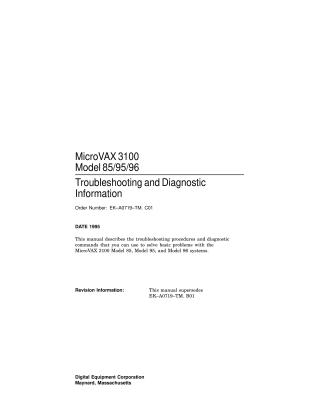 This document, "MicroVAX 3100 Model 85/95 Troubleshooting and Diagnostic Information" (Order Number: EK-A0719-TM. B01, June 1994), is a manual designed to help users with some computer experience solve basic problems with their MicroVAX 3100 Model 85 and Model 95 systems.
