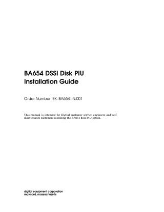 Purpose: It provides comprehensive instructions for Digital customer service engineers and self-maintenance customers to install the BA654 DSSI Disk PIU (Processor Interface Unit) option into H9F00- Ax system cabinets or H9F00- Bx expander cabinets to provide additional I/O.