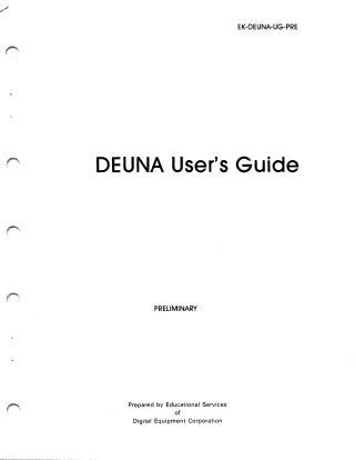 This document is the DEUNA User's Guide (EK-DEUNA-UG-001), providing comprehensive information on the DIGITAL Equipment UNIBUS Network Adapter (DEUNA).